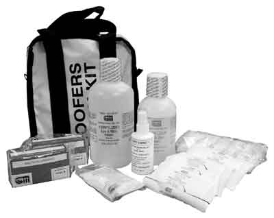 Roofmaster Burn Kit . This is stocked with all the items that will help address the unfortunate burn. Remember, asphalt will continue to burn until it is cooled. Be sure to keep an ice chest or water cooler on the job site and plunge or soak a towel, shirt or other item with cold water to cool the affected area.
